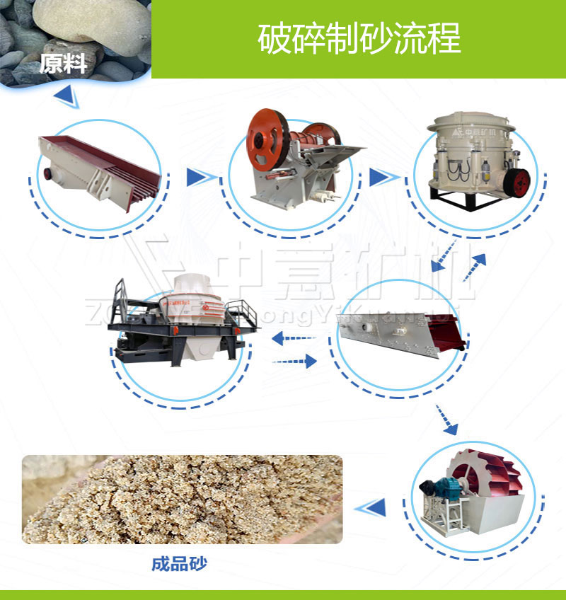 制砂生產(chǎn)線由給料機(jī)、粗破(顎式破碎機(jī))、制砂機(jī)(細(xì)碎機(jī))、洗砂機(jī)、篩分設(shè)備和膠帶傳輸機(jī)等設(shè)備組合而成。根據(jù)不同的工藝要求,各種型號(hào)的設(shè)備進(jìn)行組合,可以生產(chǎn)出不同粒度的砂石。制砂生產(chǎn)線設(shè)備可用于硬質(zhì)石灰石、花崗石、玄武巖、河卵石、冶多渣等多種物料的骨料及人工造砂作業(yè),適用于水電、建材、高速公路、城市建設(shè)等行業(yè)的應(yīng)用。