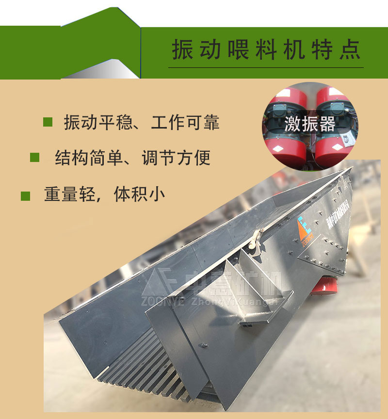 振動(dòng)給料機(jī)在生產(chǎn)流程中,可把塊狀、顆粒狀物料從貯料倉中均勻、定時(shí)、連續(xù)地給到受料裝置中去,在砂石生產(chǎn)線中,可為破碎機(jī)械連續(xù)均勻地喂料,并對(duì)物料進(jìn)行粗篩分,廣泛用于冶金、煤礦、選礦、建材、化工、磨料等行業(yè)的破碎、篩分聯(lián)合設(shè)備中。