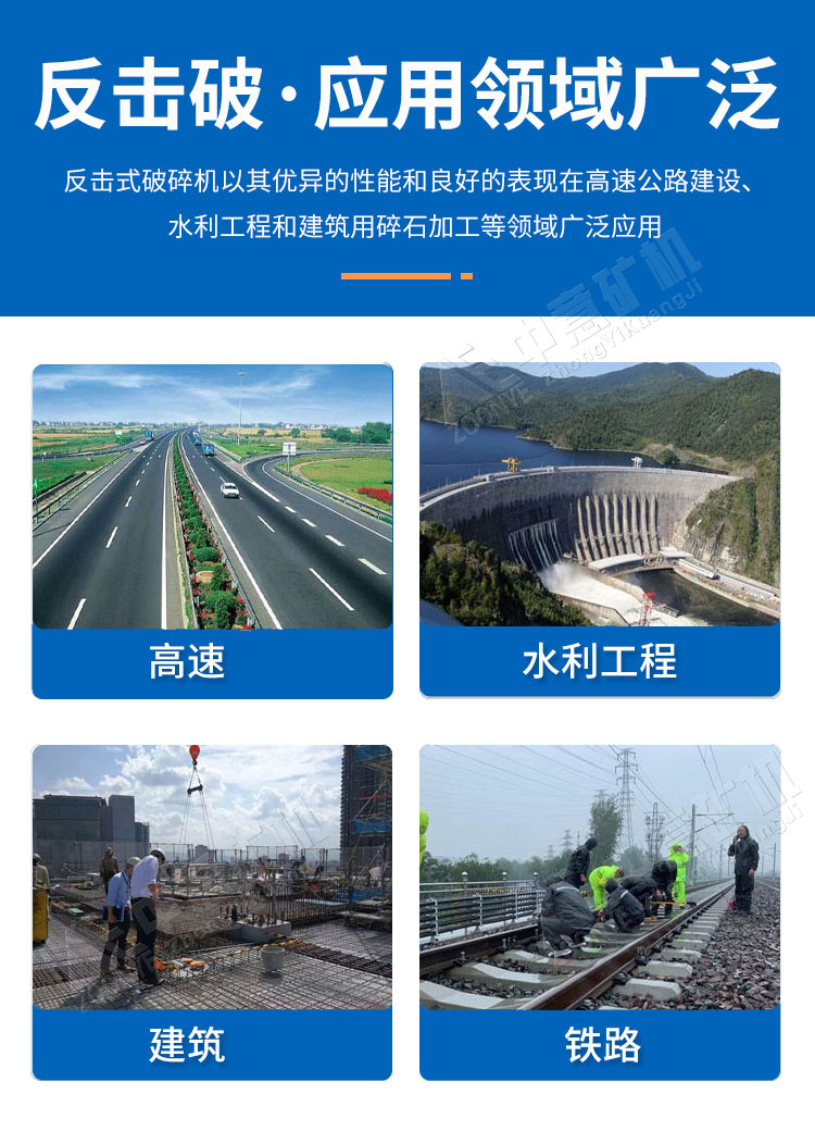 反擊式破碎機(jī)適用于硬巖破碎,可破碎抗壓強(qiáng)度不超過350兆帕的礦石、巖石,具有處理量大、排料細(xì)的特點(diǎn),經(jīng)破碎的產(chǎn)品呈立方體,針片狀含量低,無內(nèi)裂縫。是高速公路、水利、機(jī)場、建筑等行業(yè)生產(chǎn)優(yōu)質(zhì)石料的設(shè)備。所以硬巖反擊式破碎機(jī)被廣泛用于高速公路的建設(shè)。